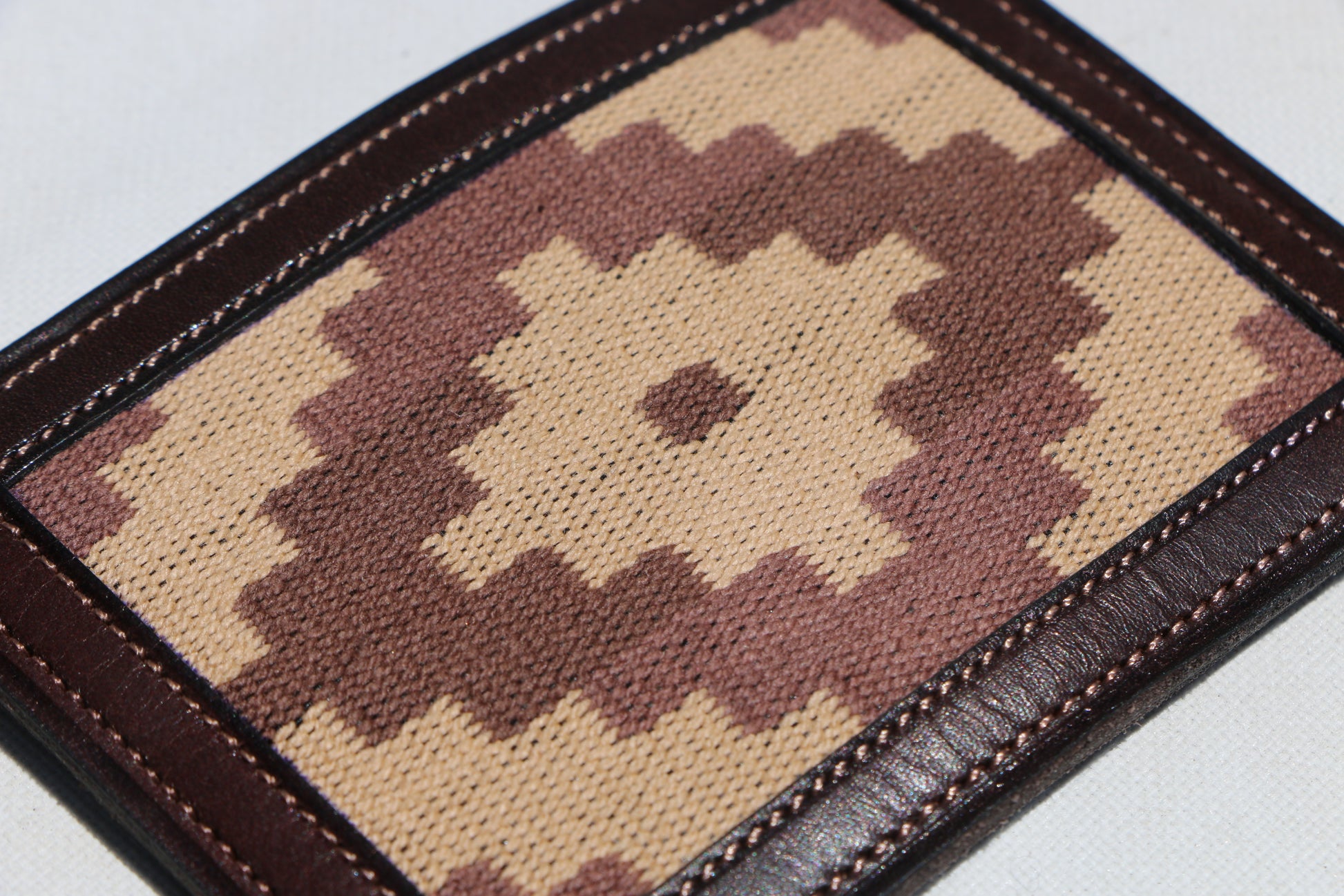 Kortholderne er laget av ekte skinn med pampa-mønster tekstil og er håndlaget i Buenos Aires, Argentina.
